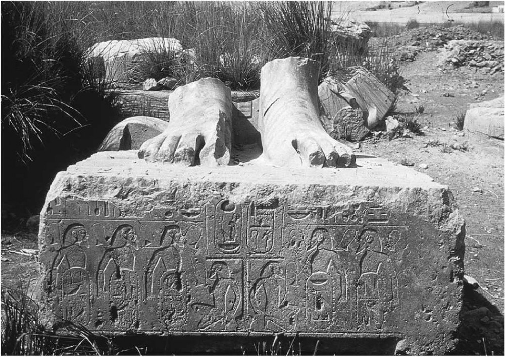 Wznoszą się na wysokość ponad 20 metrów i stoją już od ponad 3400 lat – przetrwały do dzisiaj, mimo że świątynia grobowa, która wyrastała za ich plecami, została obrabowana ze swoich wspaniałych kamiennych bloków i ostatecznie rozpadła się w pył. Dwa potężne posągi stojące przy wejściu do świątyni grobowej Amenhotepa III w Kom el Hetan były i ciągle są, nazywane niesłusznie Kolosami Memnona, co wynika z ich błędnej identyfikacji z Memnonem, mitologicznym etiopskim księciem, który poległ pod Troją zabity przez Achillesa. Oba ukazują siedzącą postać faraona Amenhotepa III, który władał Egiptem od 1391 do 1353 r. Po części właśnie z powodu owej błędnej identyfikacji Kolosy znane były już 2000 lat temu, kiedy stały się obiektem zainteresowania greckich i rzymskich „turystów” wychowanych na Iliadzie i Odysei Homera – niektórzy z nich umieścili nawet na ich nogach swoje graffiti. Jeden z Kolosów – po uszkodzeniach, których doznał w trakcie trzęsienia ziemi w I w. – zaczął słynąć z tego, że o świcie wydobywały się z niego dziwne świsty, kiedy kamienie kurczyły się i rozszerzały w czasie chłodnych nocy i gorących dni. Na nieszczęście dla starożytnego „ruchu turystycznego”, prace restauracyjne, które podjęto w okresie rzymskim, w II w. n.e., położyły kres owym codziennym „płaczom boga”. Jednak pomimo fascynacji, którą powszechnie budzą, to nie owe Kolosy są istotne dla naszej opowieści o wydarzeniach z XIV w. Dużo bardziej interesująca jest ostatnia z pięciu baz posągów stojących w szeregu na kierunku północ- południe, które wyznaczały granicę wznoszącej się tu niegdyś świątyni. Znajdowała się ona na zachodnim brzegu Nilu, w pobliżu słynnej dzisiaj Doliny Królów, po przeciwnej stronie rzeki od dzisiejszego miasta Luksor. Na owych pięciu bazach stały nadnaturalnej wielkości posągi króla, chociaż nie były one równie potężne jak Kolosy ustawione przy wejściu do świątyni. Na dziedzińcu, gdzie się znajdowały, wznosiło się łącznie niemal 40 takich posągów i ich baz.